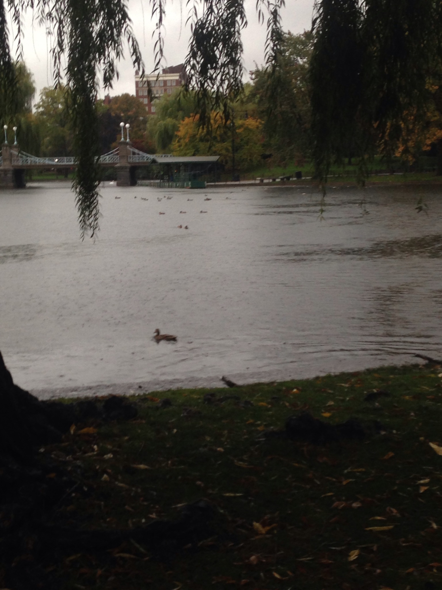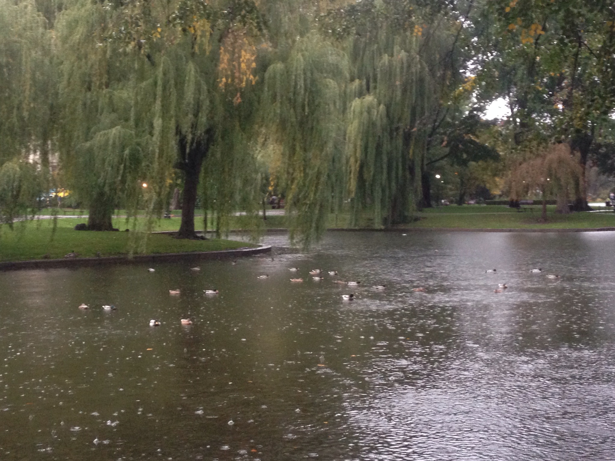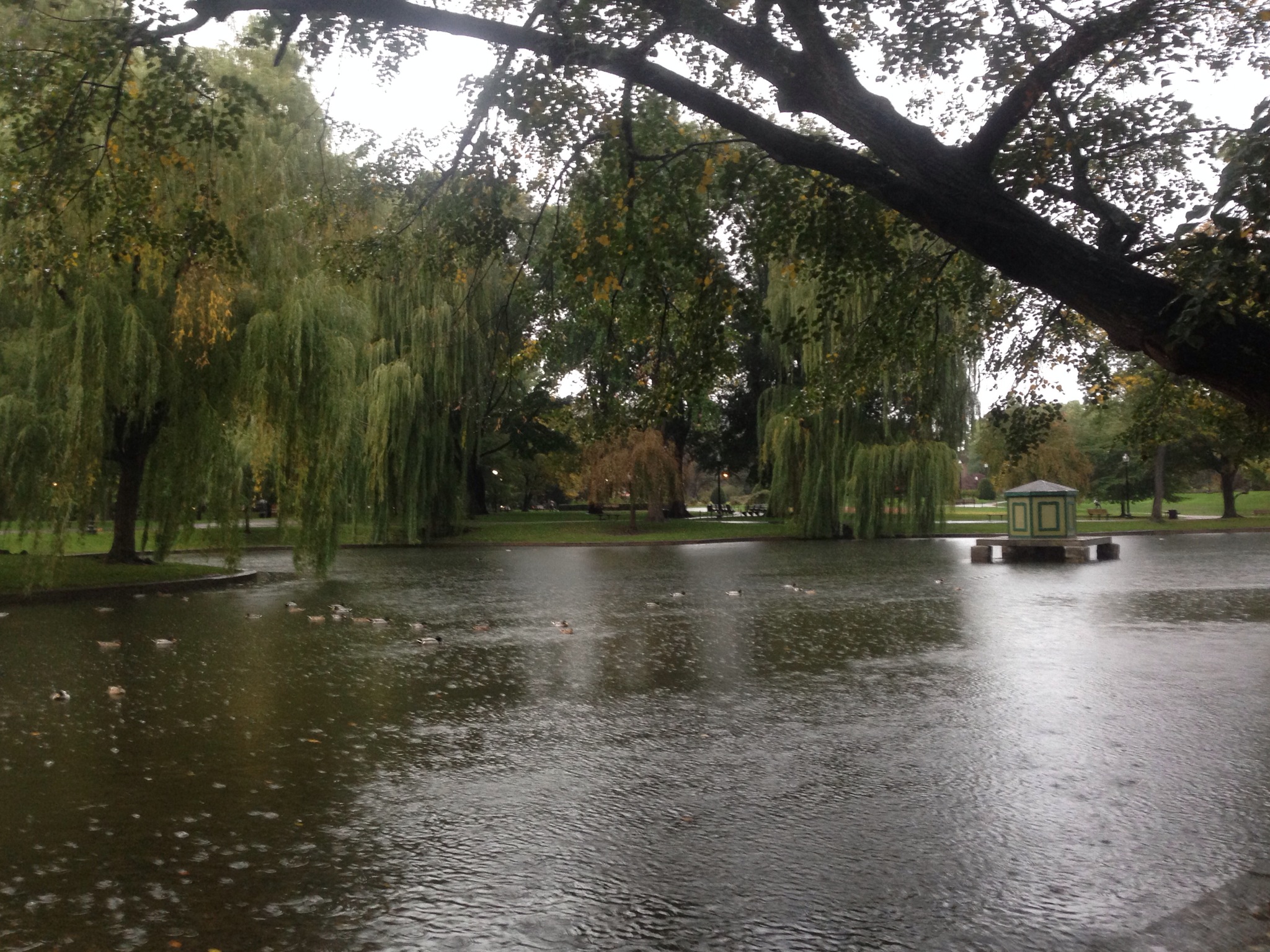 The Public Garden was empty save for the ducks that huddled into themselves as they floated on a rainy pond.