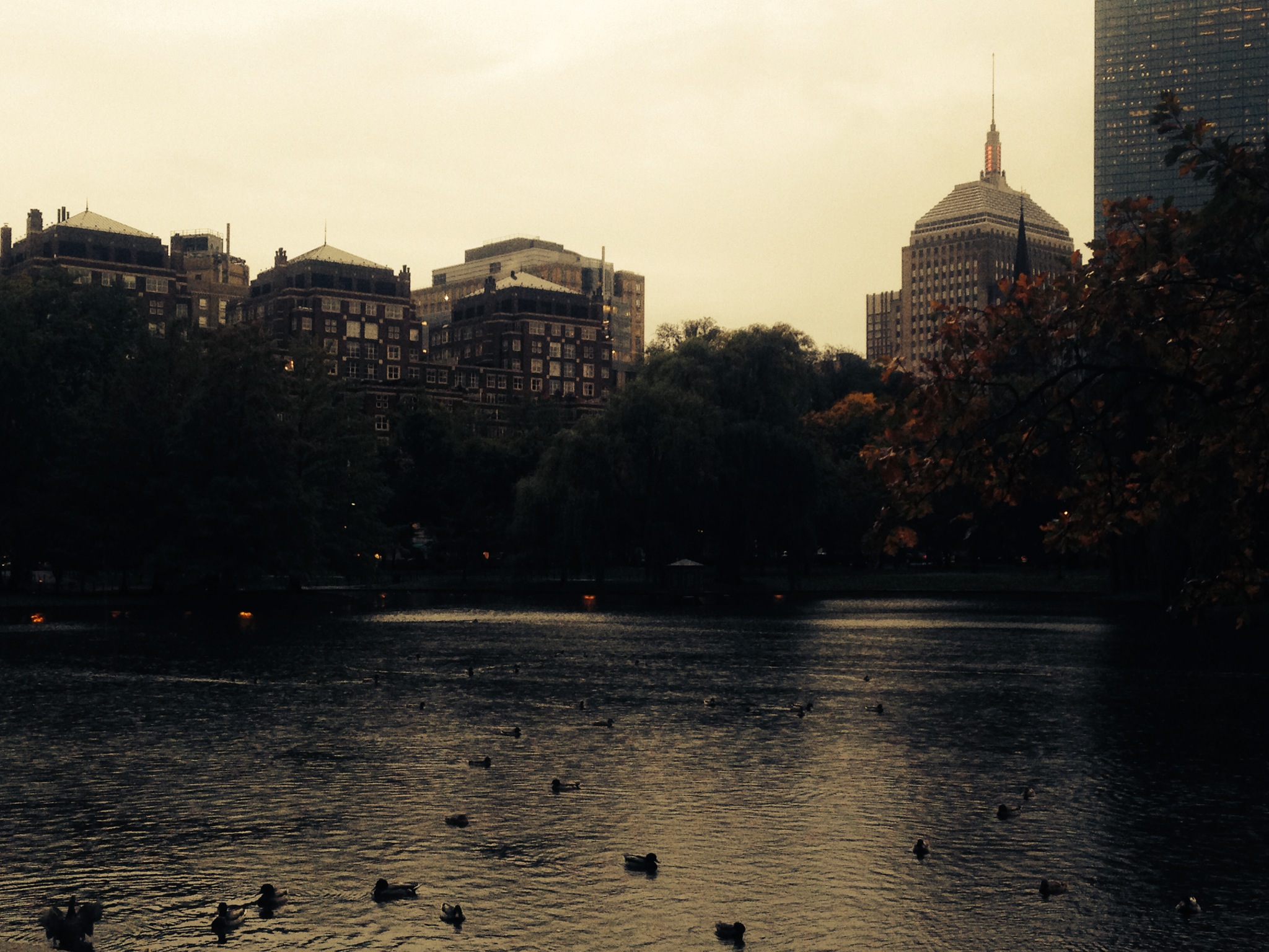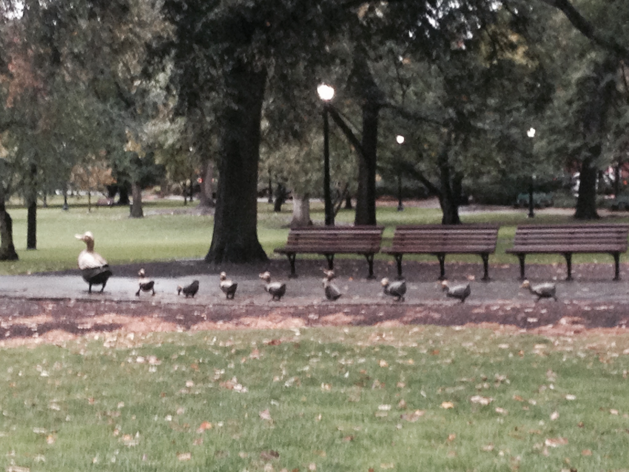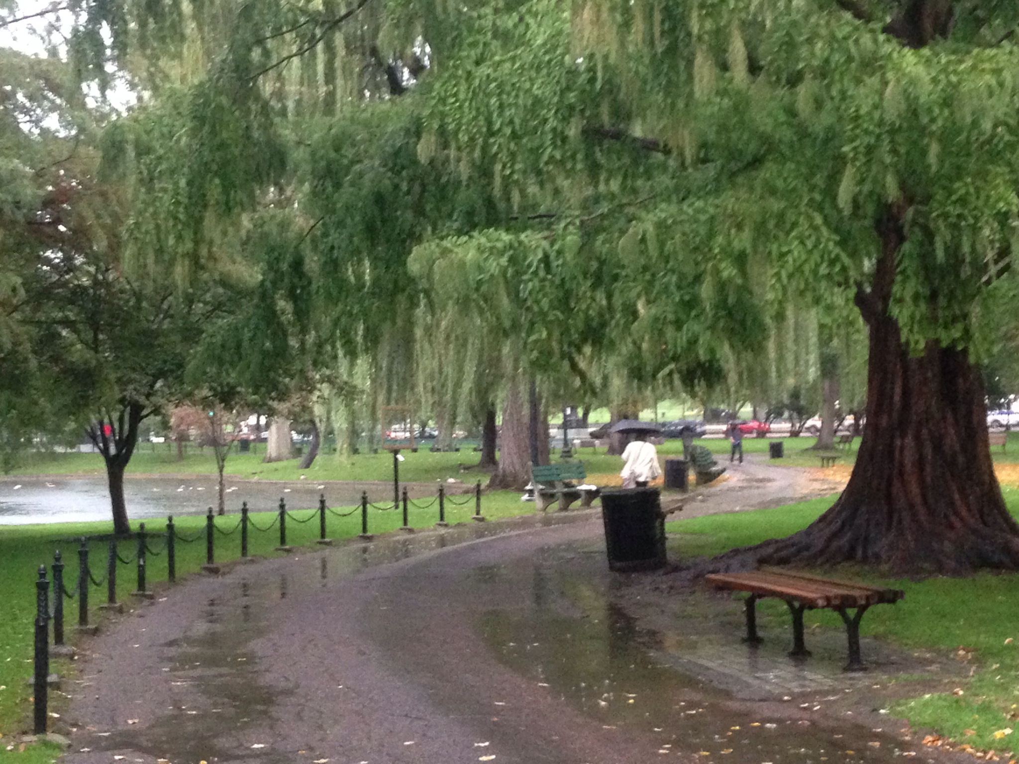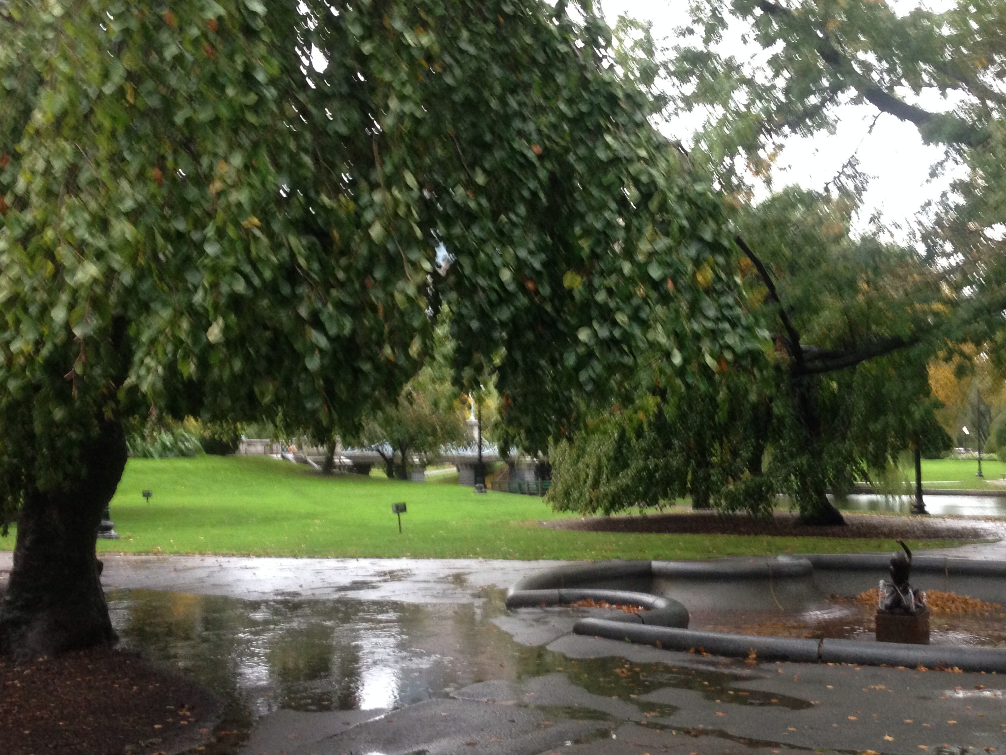 The Public Garden was empty save for the ducks that huddled into themselves as they floated on a rainy pond.