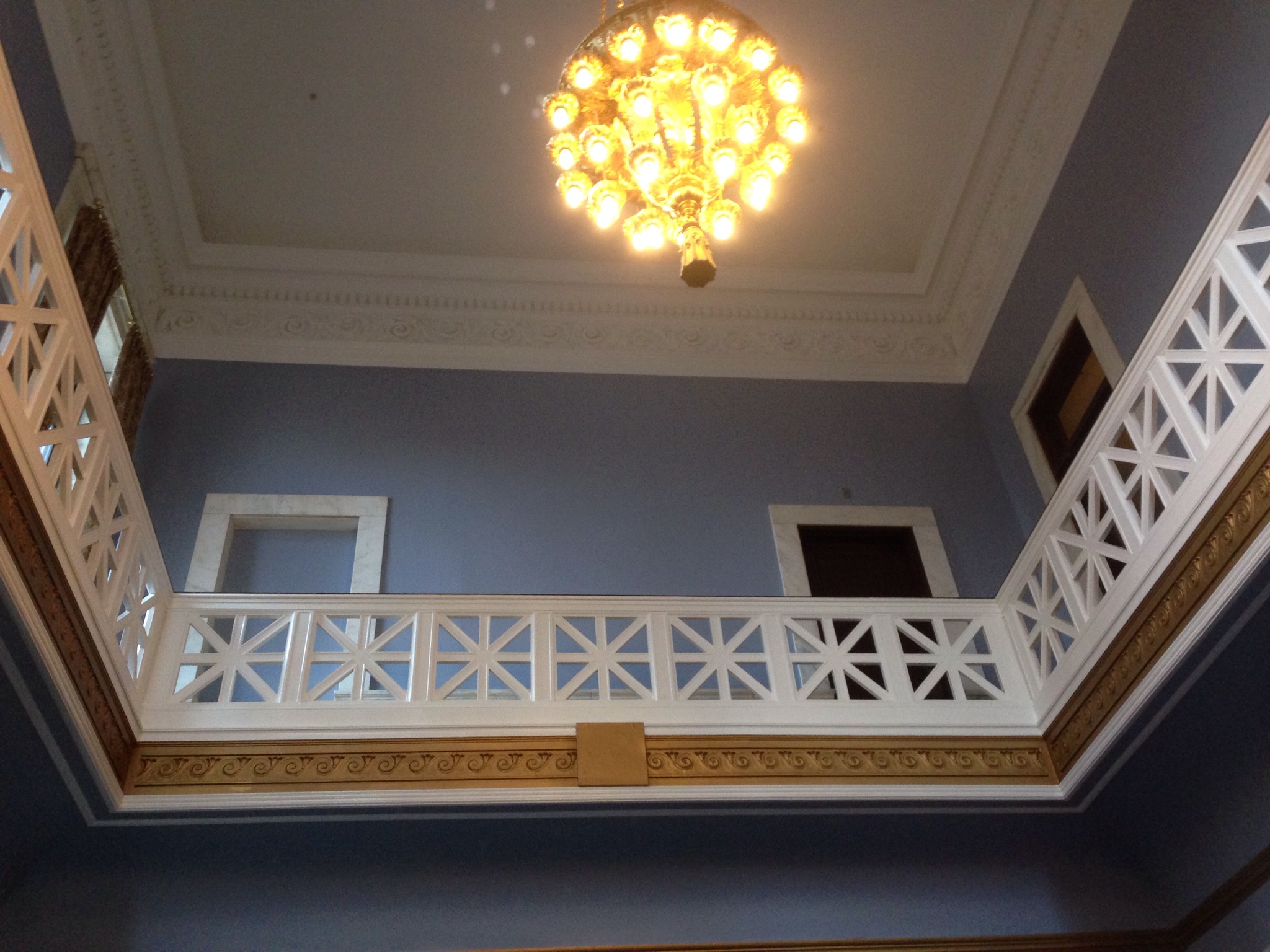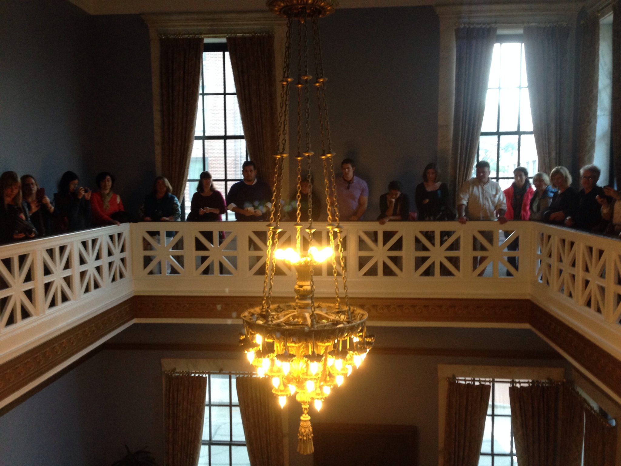 The chandelier in the counting room is original from 1837. To change a bulb, they need three people – two to pull and hold it to the side of the balcony and one to actually change the lightbulb. Not a good day when a light goes out!