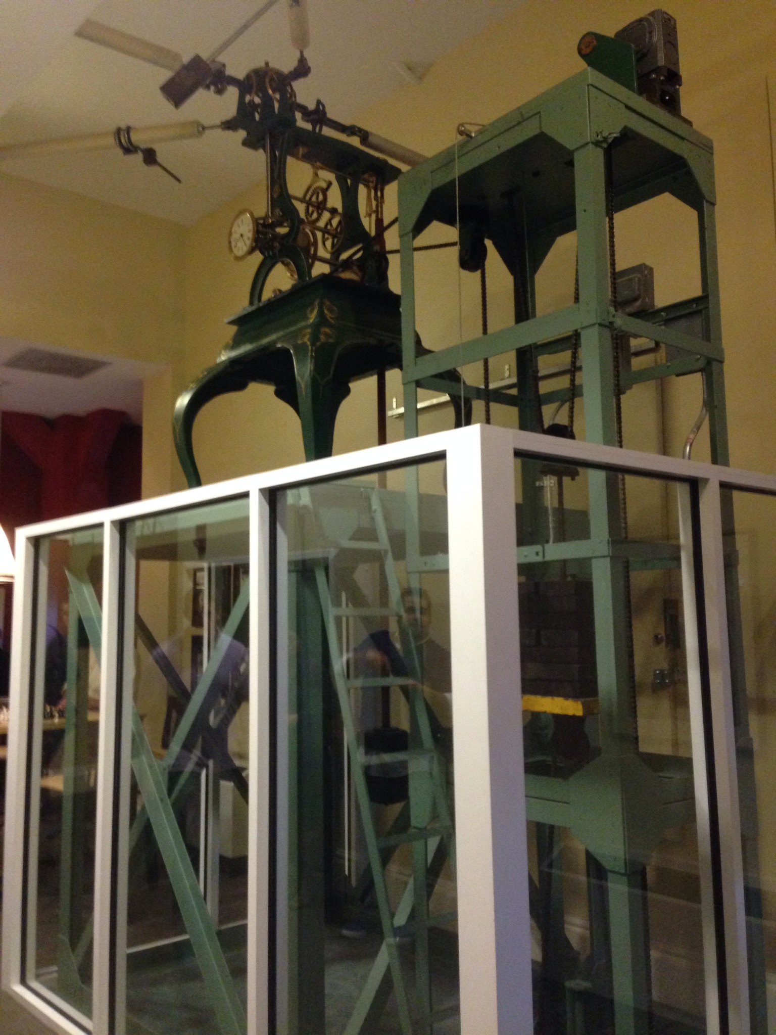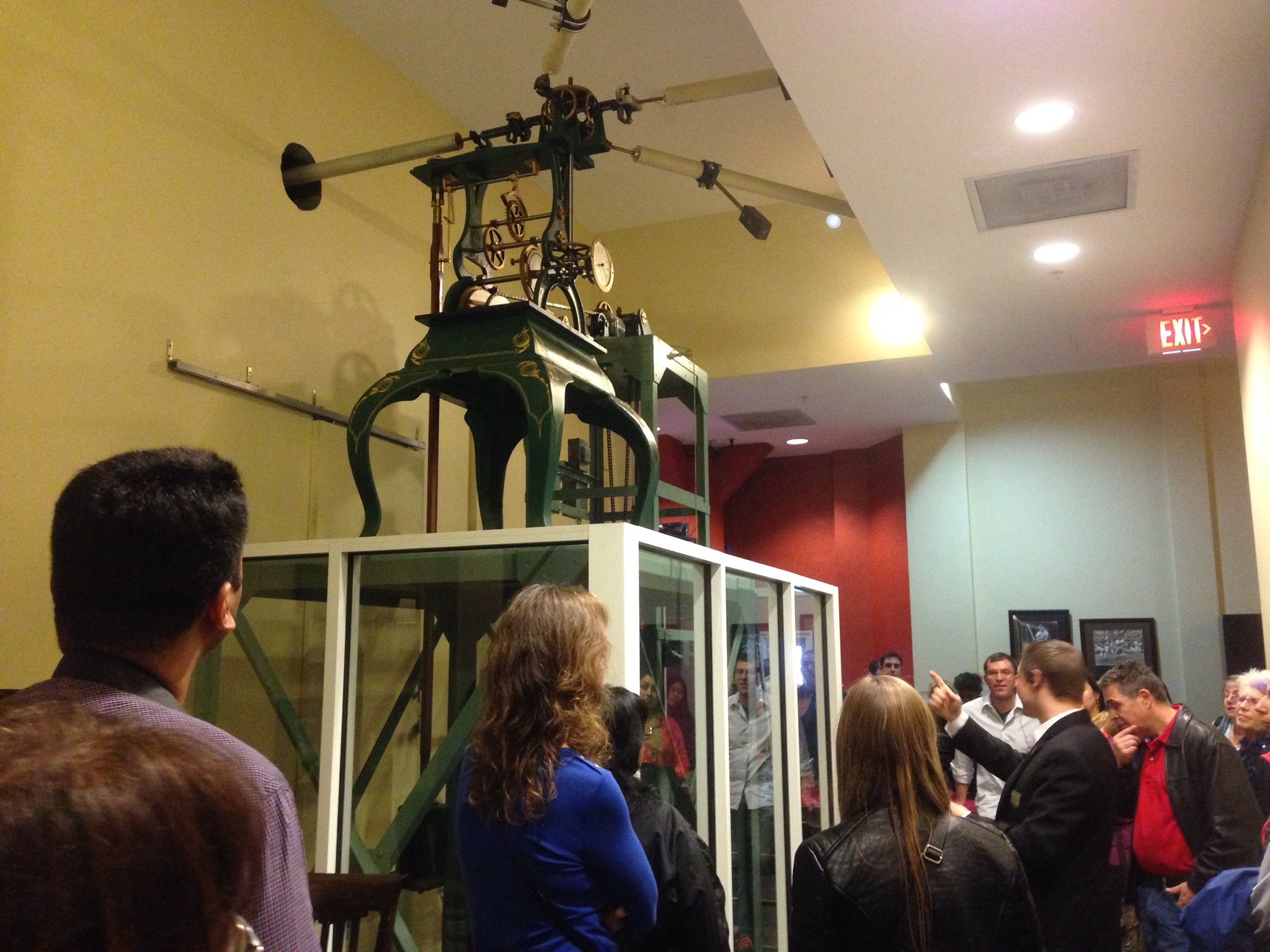 Our next stop was the 24th floor, where the four clocks on the tower are housed. Built in 1916 (the year my grandmother was born), the long running joke of Bostonians was that the clocks were a “four faced liar” because each clock had always displayed a different time. The glass box with the gears and miniature clock on top fixed that and now all clocks show the correct time. (Read the green sign for more info.)