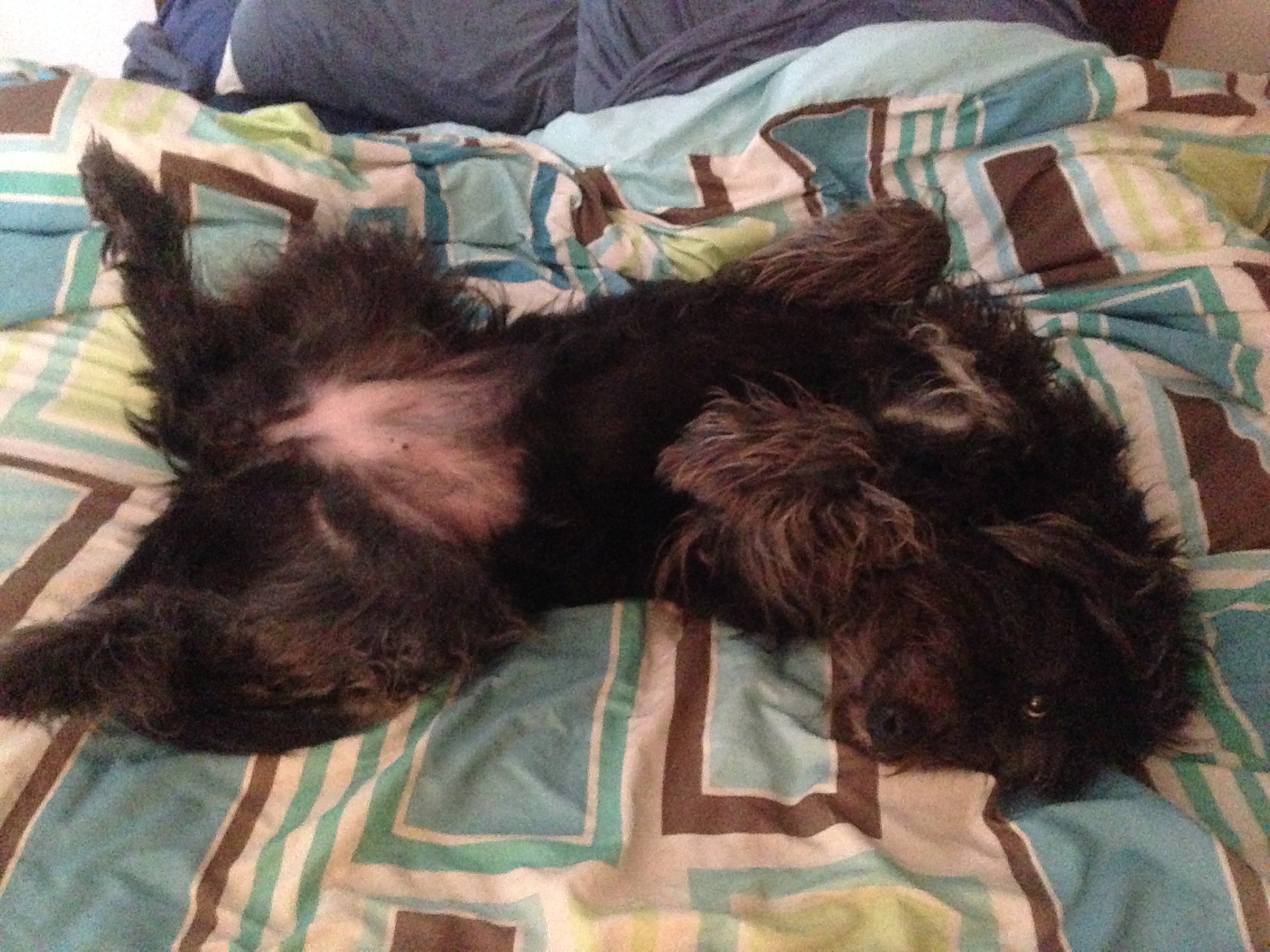 Here’s a pic of my precious Brenna, taking over the bed and looking at me like she doesn’t care about it at all. Yeah…that’s most mornings. But I digress…